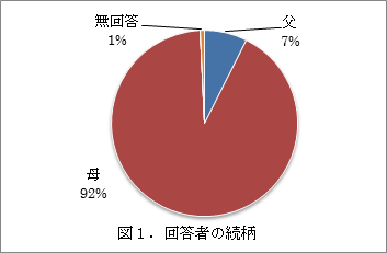 調査票の回答者の内訳は,図1のようになりました。回答者は,母親が124名(92%)と最も多く,父親は10名(7%),無回答が1名(1%)でした。