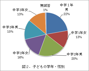 子どもの学年,性別の内訳は図2に示しました。中学1年男子と中学2年男子の保護者からの回答がやや多いようです。