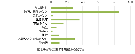 子どもに関する現在の心配ごとについて尋ねました(図4)。この項目は複数回答可であるため,割合の合計は100%になりません。以下,「複数回答」と記載してある項目も同じです。