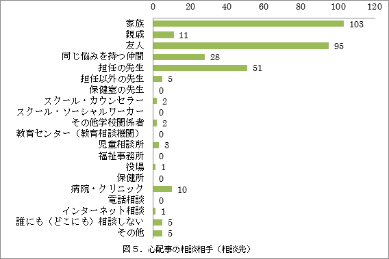 子どものことで心配ごとが生じた際の保護者の相談相手(相談先)について尋ねました(図5)。