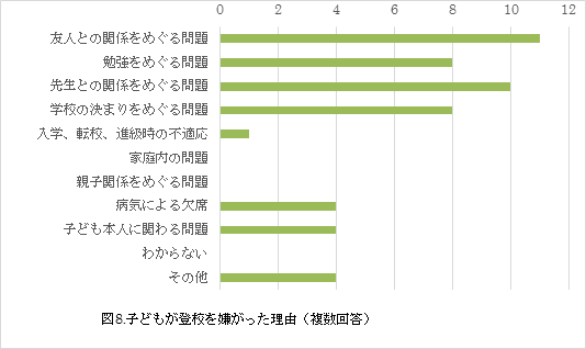 子どもの登校状況に関する設問において,「一時的に登校を嫌がることがあった」または「長期にわたり登校を嫌がることがあった」と回答した保護者27名に対して,さらにその理由を尋ねました(図8)。