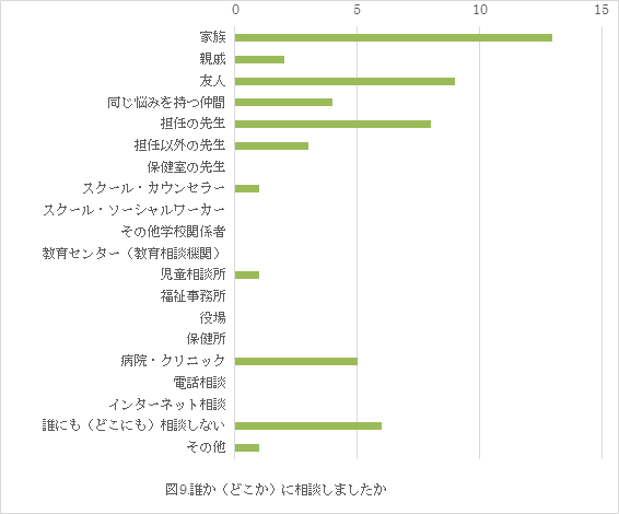 子どもの登校状況に関する設問において,「一時的に登校を嫌がることがあった」または「長期にわたり登校を嫌がることがあった」と回答した保護者27名に対して,このことに関する相談相手(相談相手)を尋ねました(図9)。