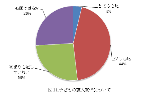 記述回答では,「人とのかかわりをさけていて,今は友人がいない」「小学校時代と比べ,人数も増え,彼の事を知らない子ども達ばかりなので,お互いにトラブルになるのではないかと心配」「スマホのライングループがクラスであるみたい。子供はガラケーなのでラインができないと言う。スマホにかえるか,そのままか悩んでいる」「最近,Lineで親の知らないところでコミュニケーションが広がっていたことが発覚した」「聞いてもあまり話してくれないのでよくわからない」などがありました。
