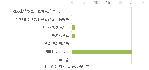 子どもの登校状況に関する設問において,「一時的に登校を嫌がることがあった」または「長期にわたり登校を嫌がることがあった」と回答した保護者27名に対して,学校以外の居場所の利用について尋ねました(図16)。その結果,「フリースクール」と「子ども食堂」がともに1名(4%)ずつで,残りの25名(93%)は「利用していない」という結果でした。記述回答では,「日出町にどんな場所があるのか,わからない。別府や大分にはたくさんあるようだが遠い」という記述がみられました。