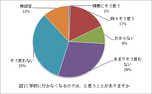 回答者全員に対して,自分の子どもが不登校になるのではないかという不安の有無について尋ねました(図17)。その結果,「頻繁にそう思う」と答えた保護者は1名,「時々そう思う」と答えた保護者は23名で,これらを合わせると24名となり,全体の18%の保護者が不登校に関する不安を抱えていることが分かりました。
