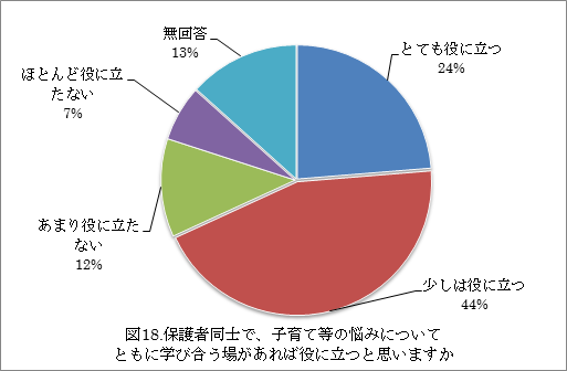 保護者同士による学び合いの場の有用性について尋ねました(図18)。その結果,「とても役に立つ」と答えた保護者は32名,「少しは役に立つ」と答えた保護者は60名で,両者を合わせると92名となり,68%の保護者がこうした学び合いの場の有用性を認めていることが分かります。